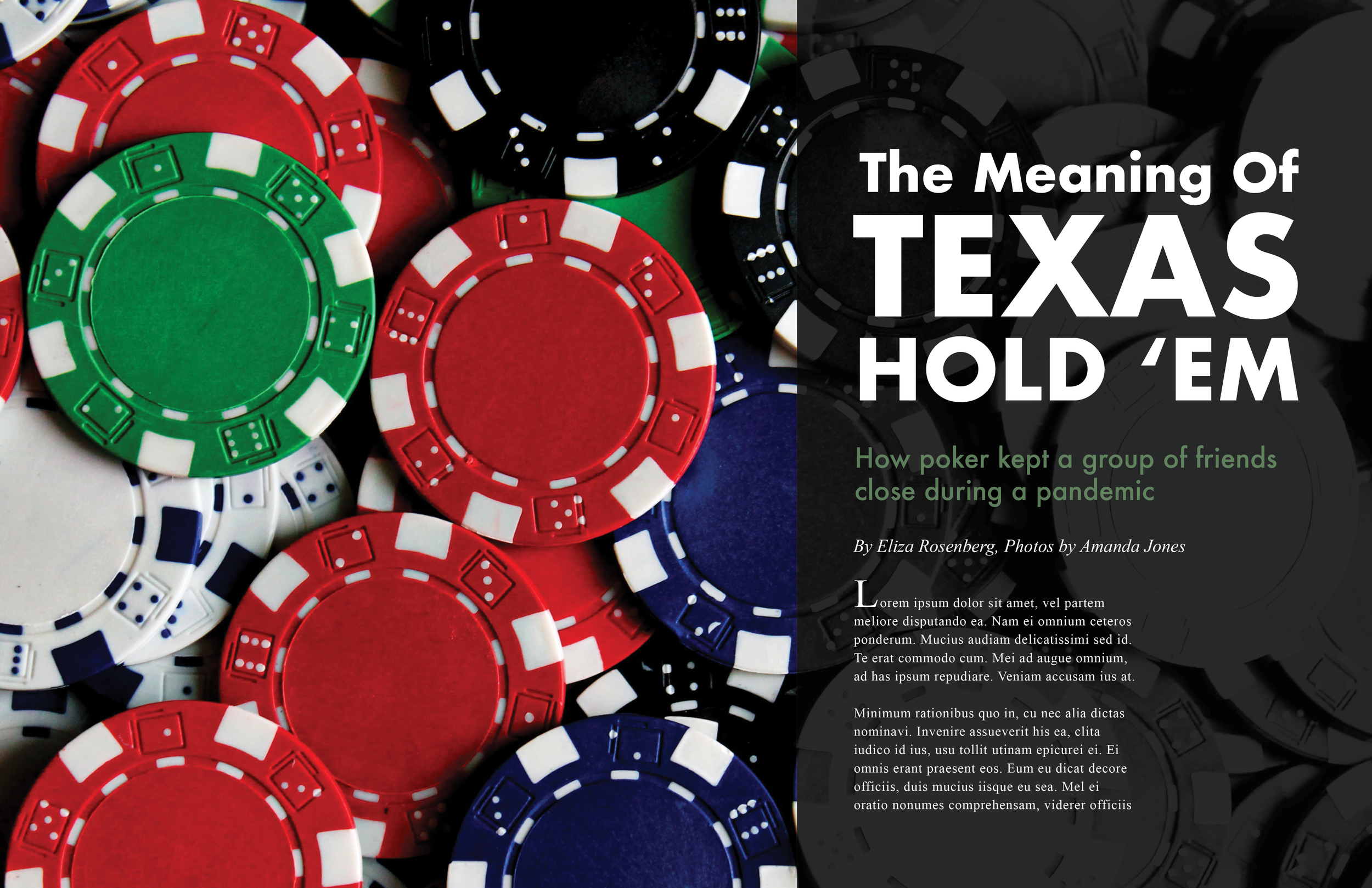 Because I am not an expert on poker theory, and I was even less so when I was working on this project, I chose to make the focus of the main article my emotional connection to the game rather than an informational piece. I also felt like an explanation on poker theory was something that could be easily looked up online, while someone’s story is something that would be unique to the magazine.